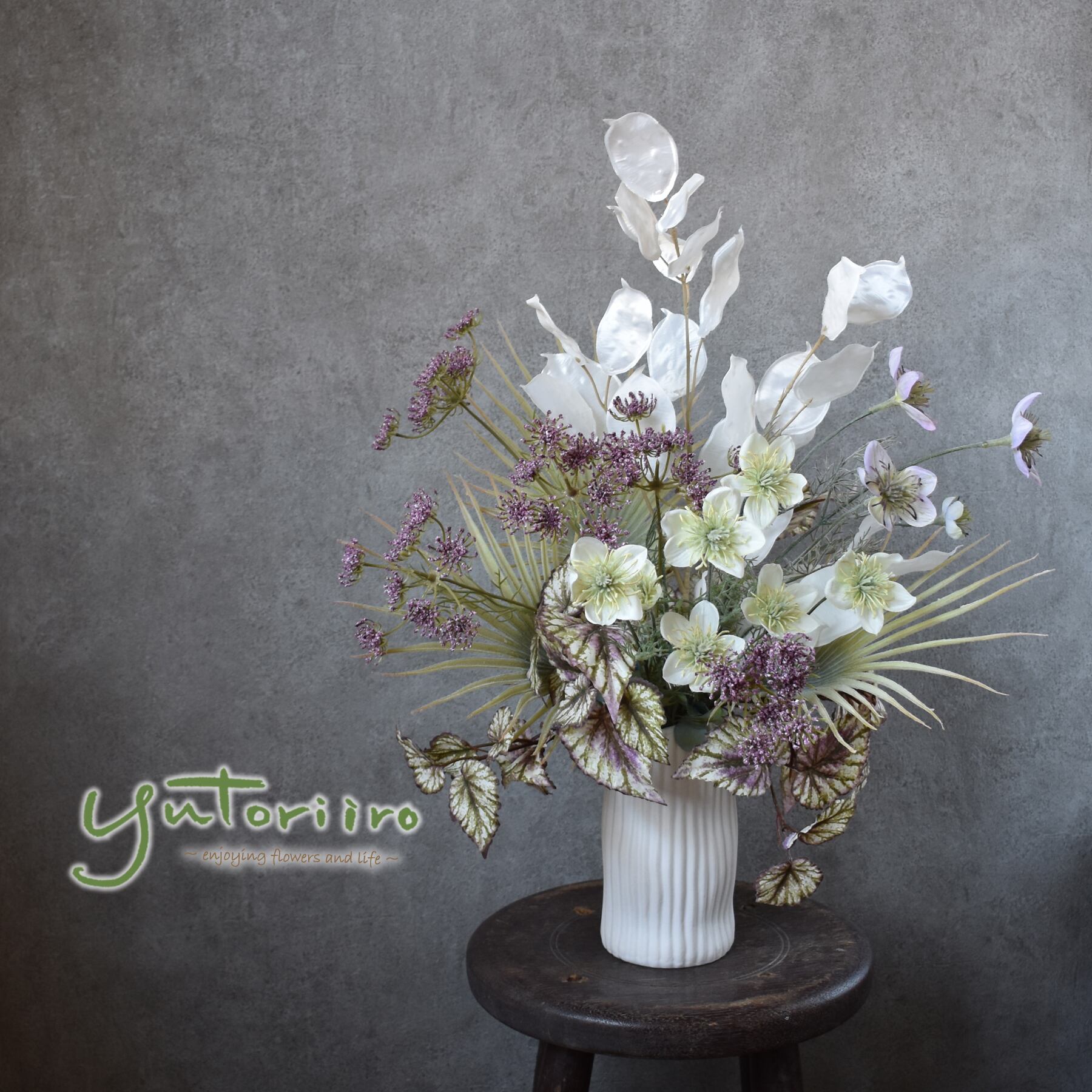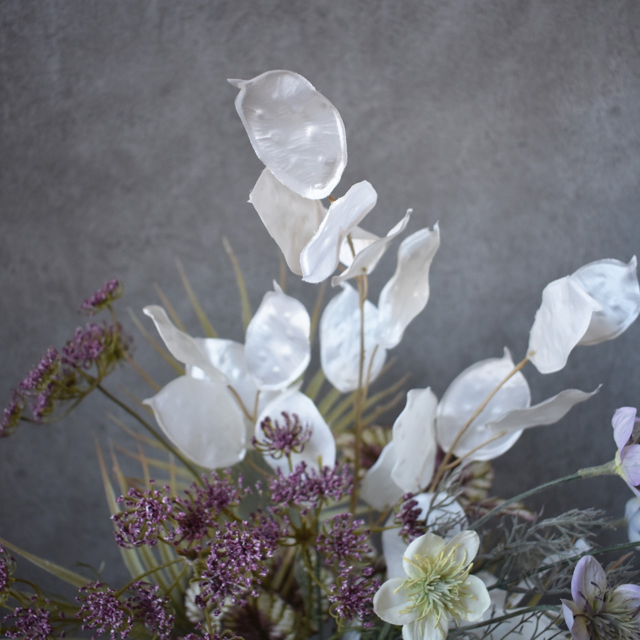 柔らかな月明かりに照らされるような、透明感あるルナリアシードとニゲラ、レースフラワーを使用した幻想的なアレンジメントです。