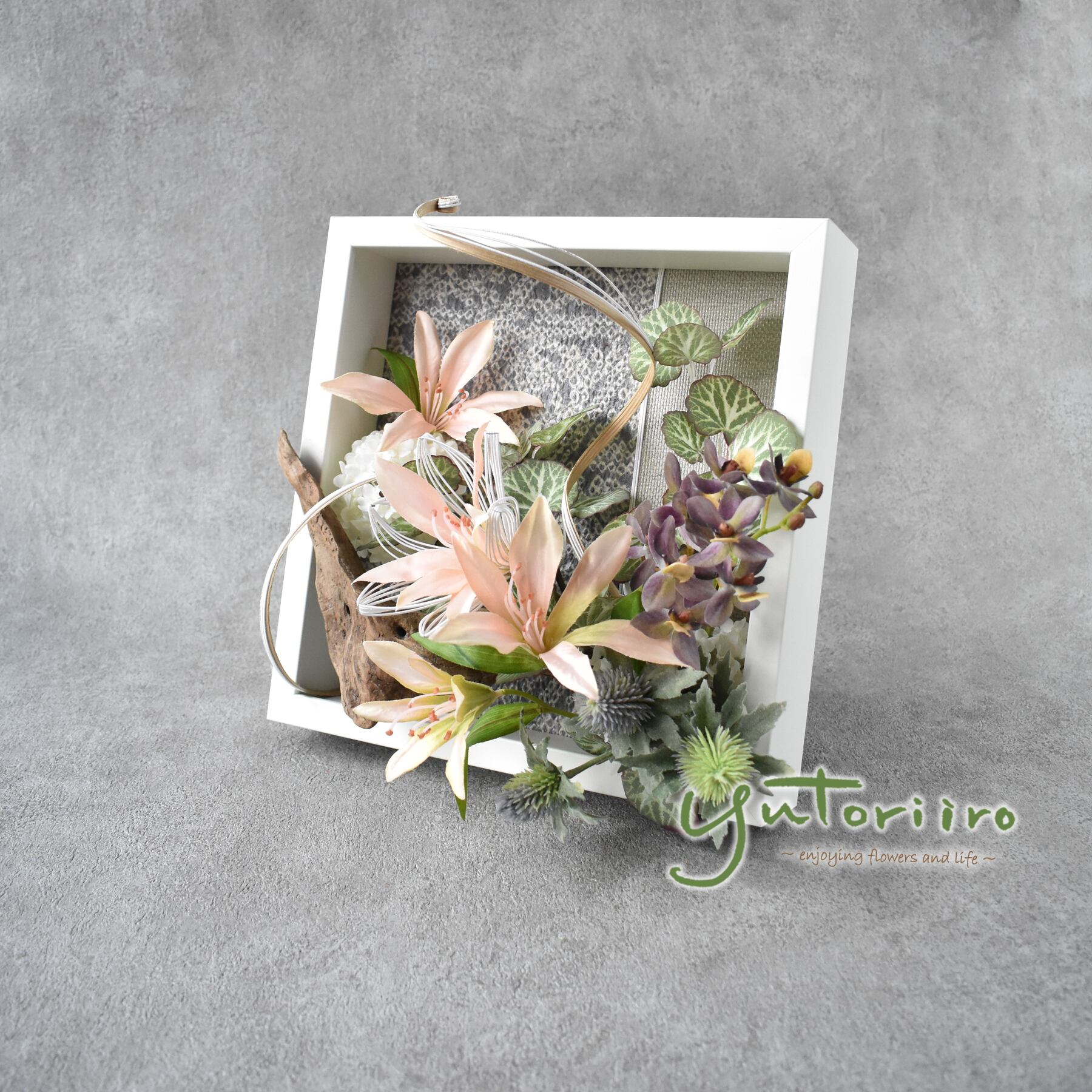 流木の力強さと、水引の繊細さ、そして花のやさしさを重ねて制作した、世界にひとつのアーティフィシャルフラワーを使用したフラワーフレームです。
