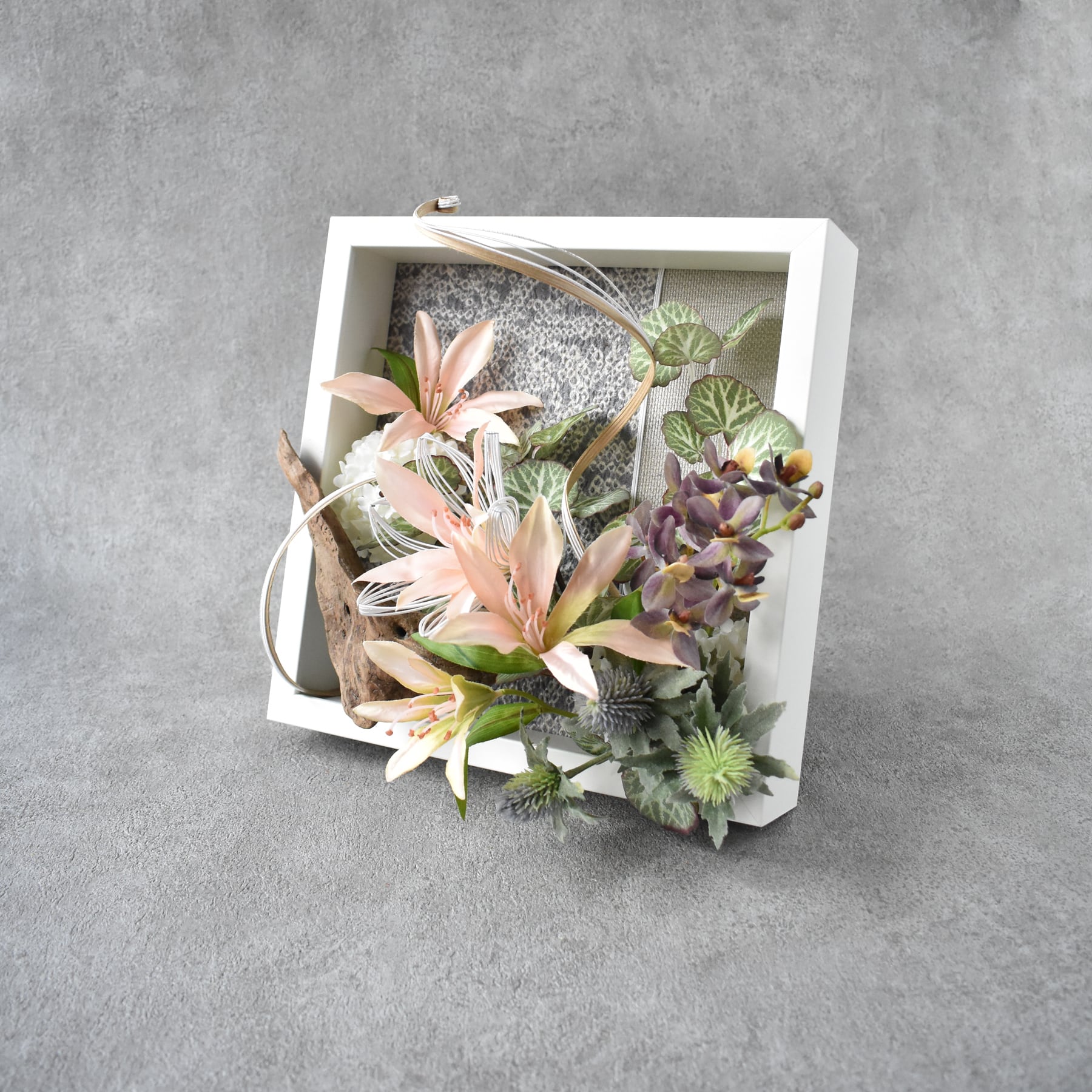 やわらかなサーモンピンクのオリエンタルリリーやシックな紫色のオーキッド(蘭)を組み合わせ、一部を水引の花びらにすることで、軽やかな動きを生み出した、上品で洗練された印象の和モダンフラワーフレームです。