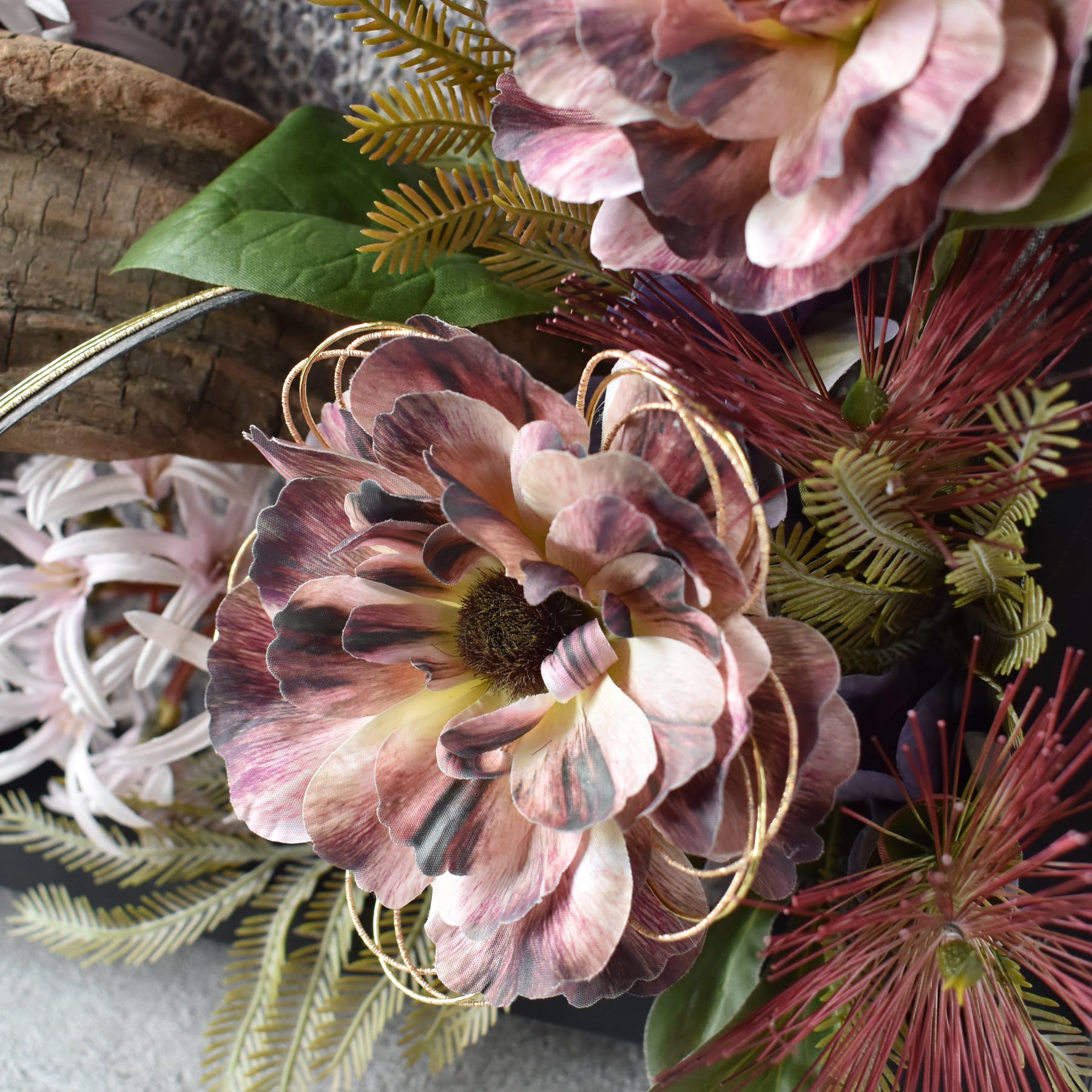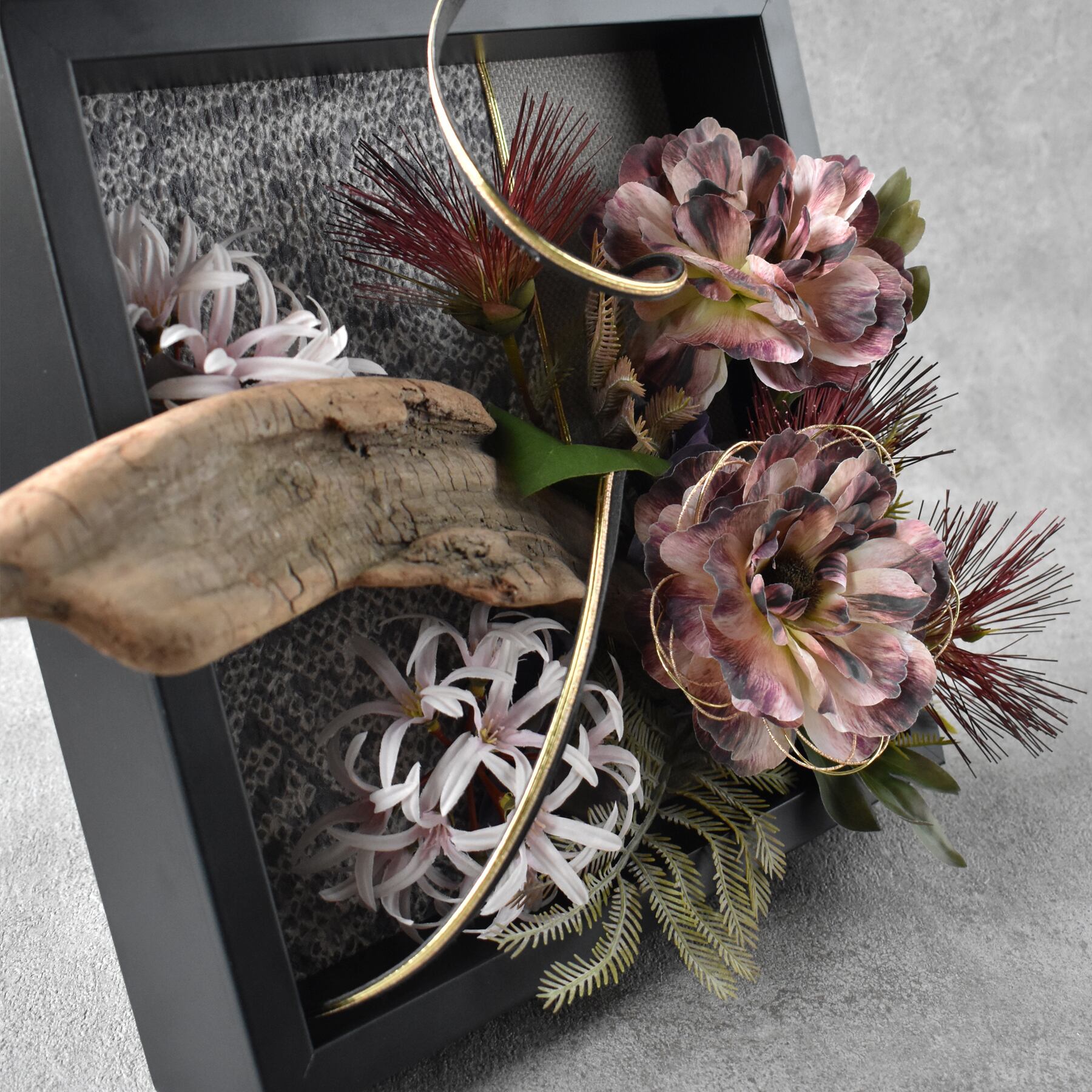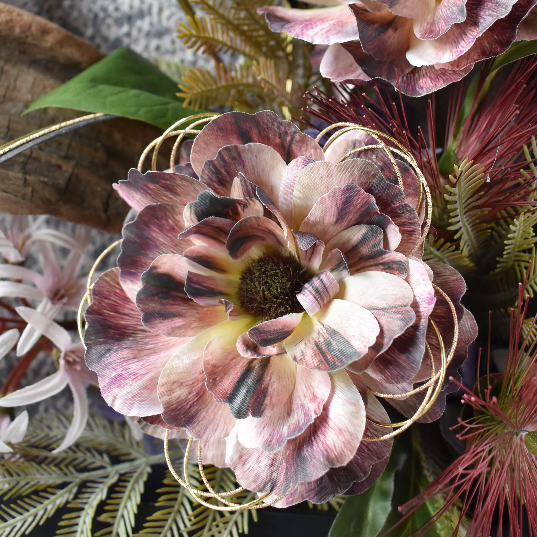 深みのある色合いのラナンキュラスとやさしい薄ピンクのネリネ、流木の力強さ、そして金色の水引で立体的に。