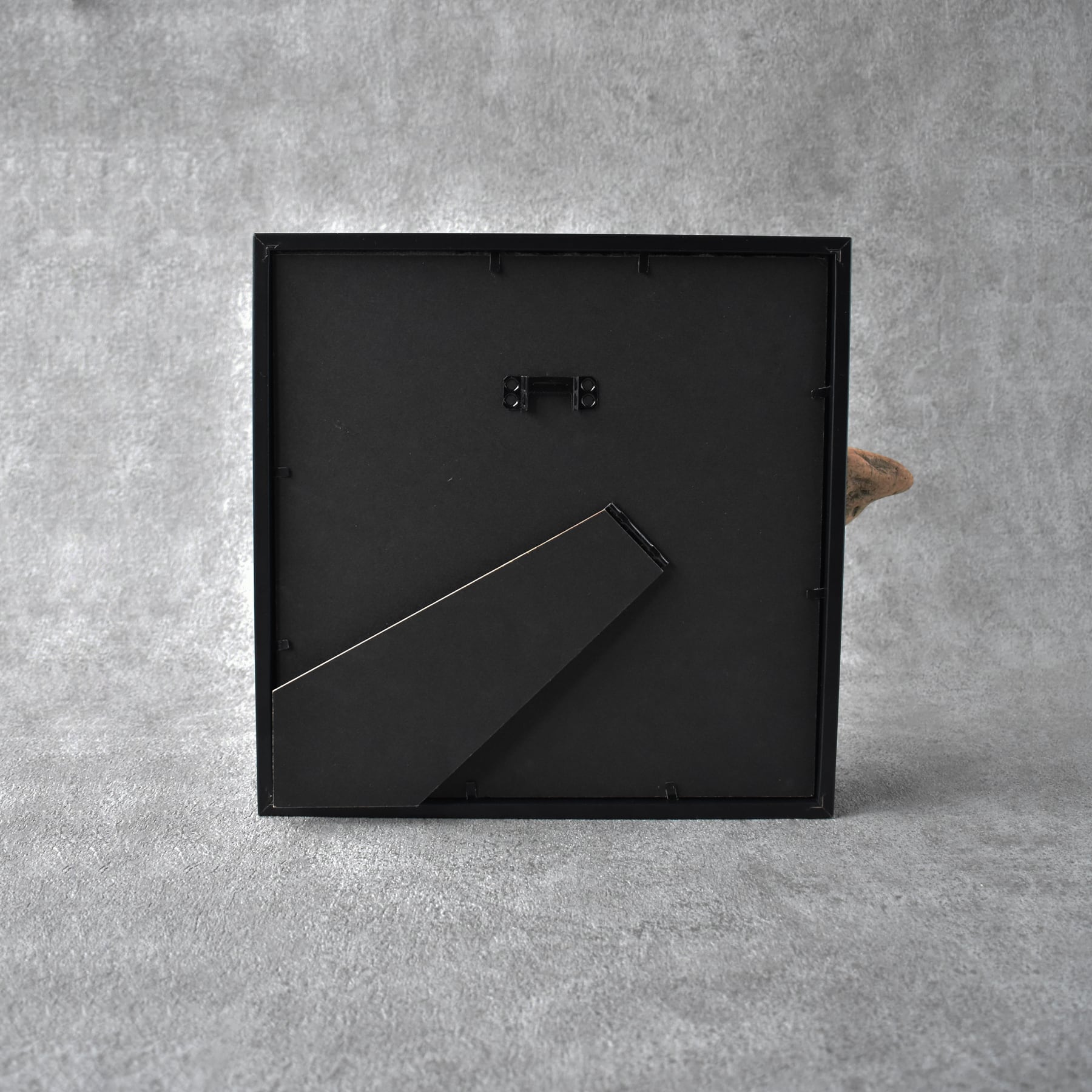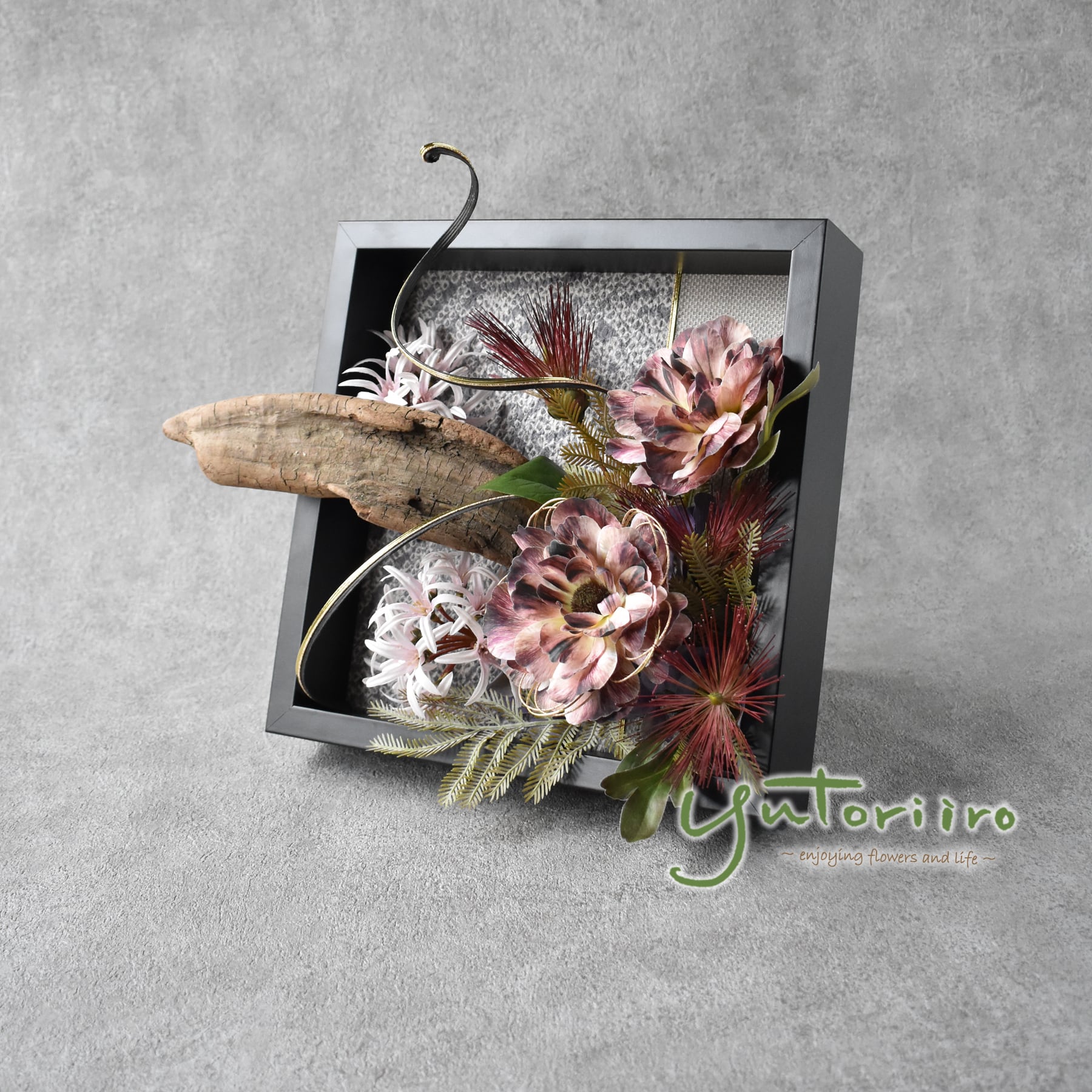 絞り染めの着物生地を背景にした黒のフレームに、日本の伝統美を現代の暮らしに馴染む形で表現しました。