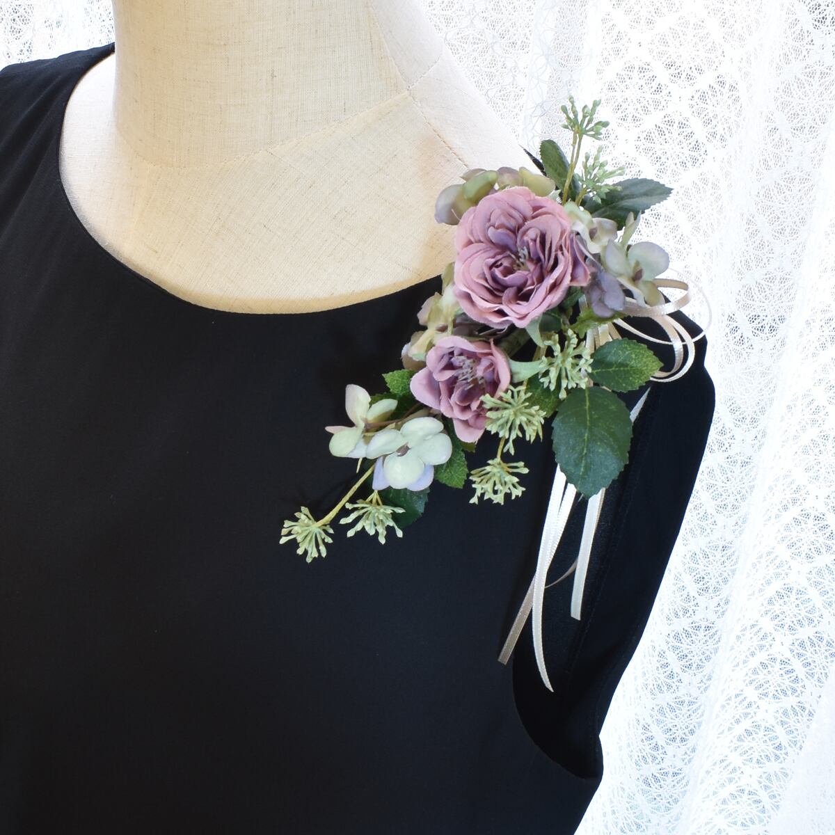 紫がかったくすみピンクの野ばらと、紫陽花のコサージュ。