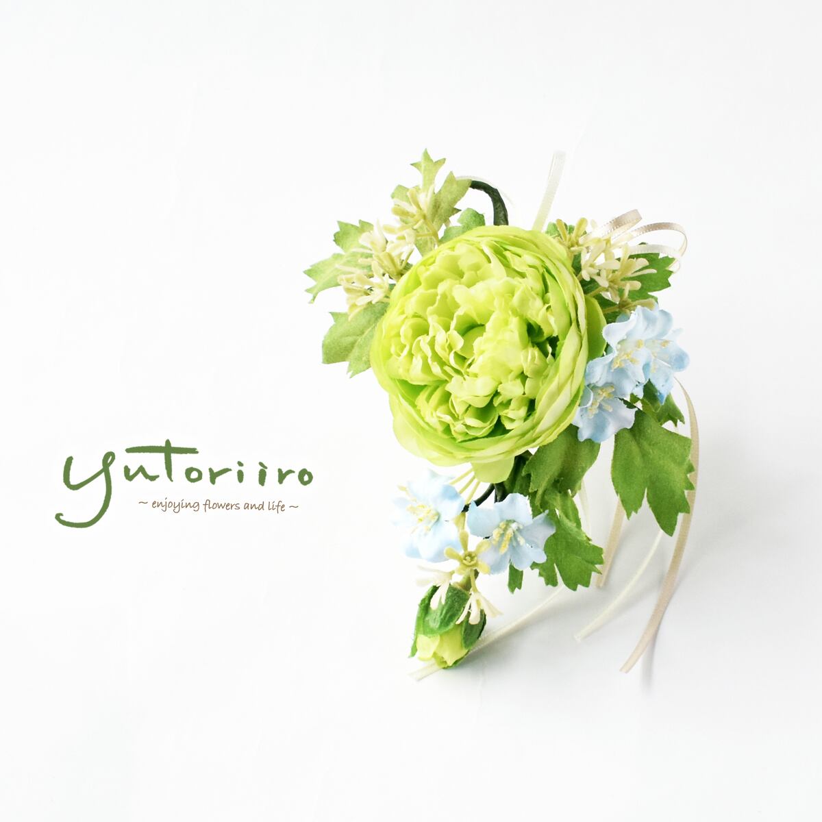 ライトグリーンのラナンキュラスと爽やかなブルーのガーデンブロッサムのコサージュ。