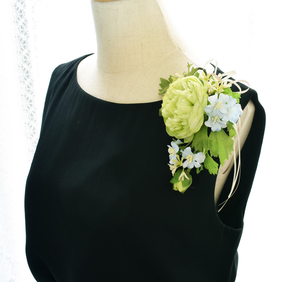大人の方が、派手になりすぎず、落ち着いた中にもかわいらしさのあるコサージュをと思って作りました。