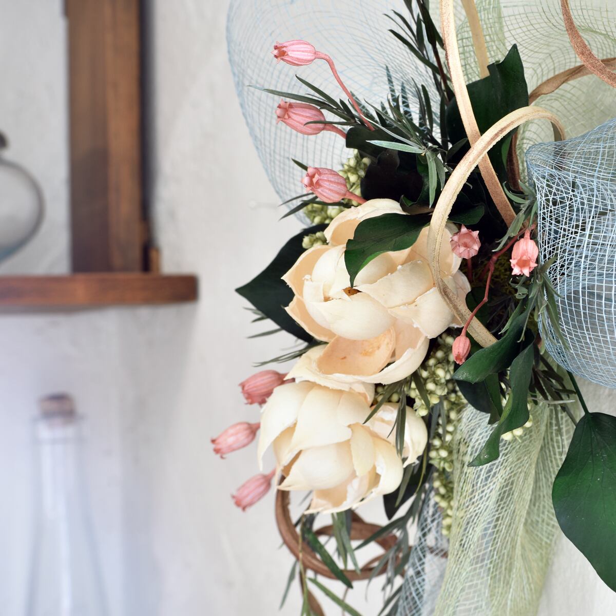 ナナチュラルでやさしい雰囲気ですが、グリーンは全てプリザーブドを使ってお作りしているので、すっきりした印象も。