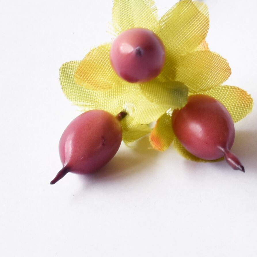 ふわっとまるいライトイエローのダリアと赤のヒペリカムの、優しい色合いの髪飾り。