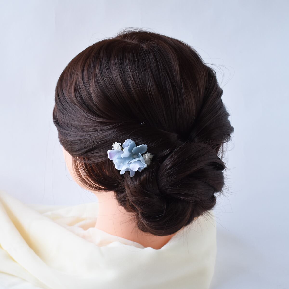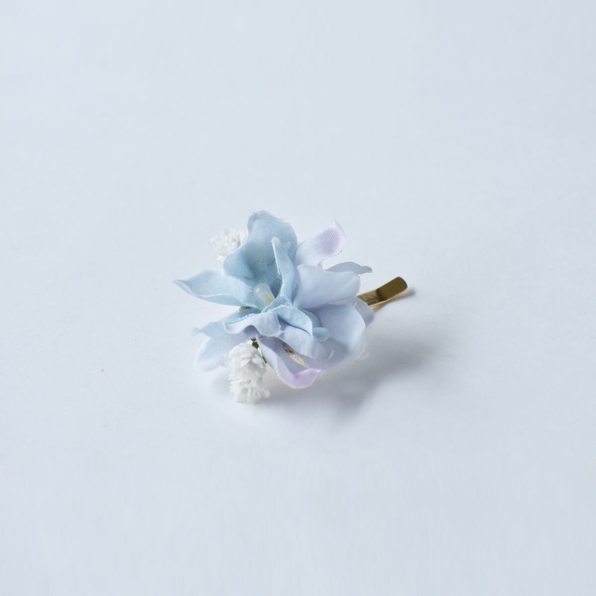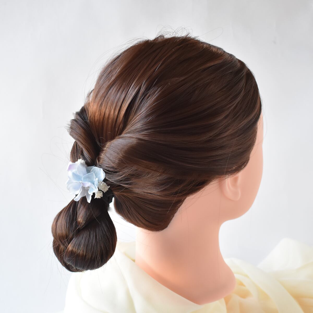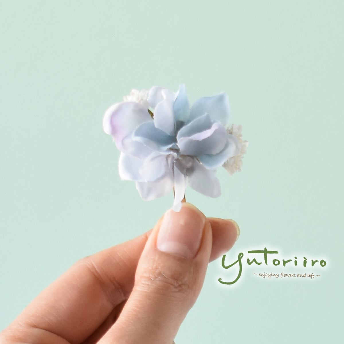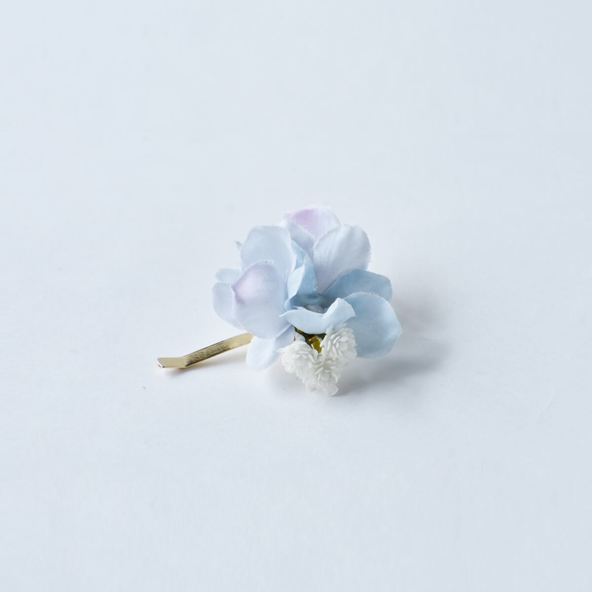 パウダーブルー×ソフトラベンダーのグラデーションがやわらかな紫陽花とカスミ草のポニーフック。