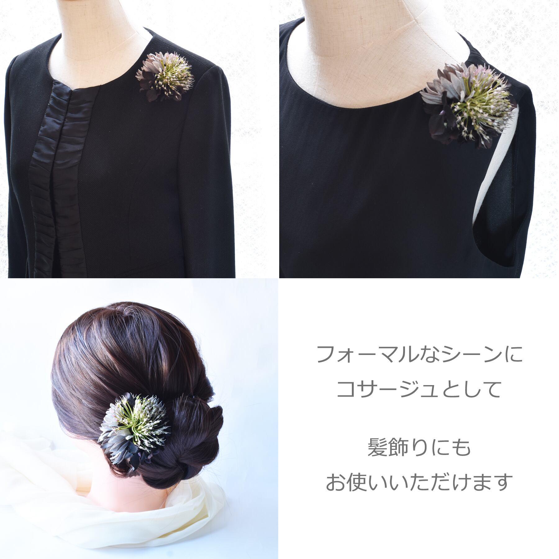グレーのデイジーと合わせた【2WAYコサージュ】は、ピンとクリップがついていますので、色々なシーンでお使いいただけるのがポイント♪