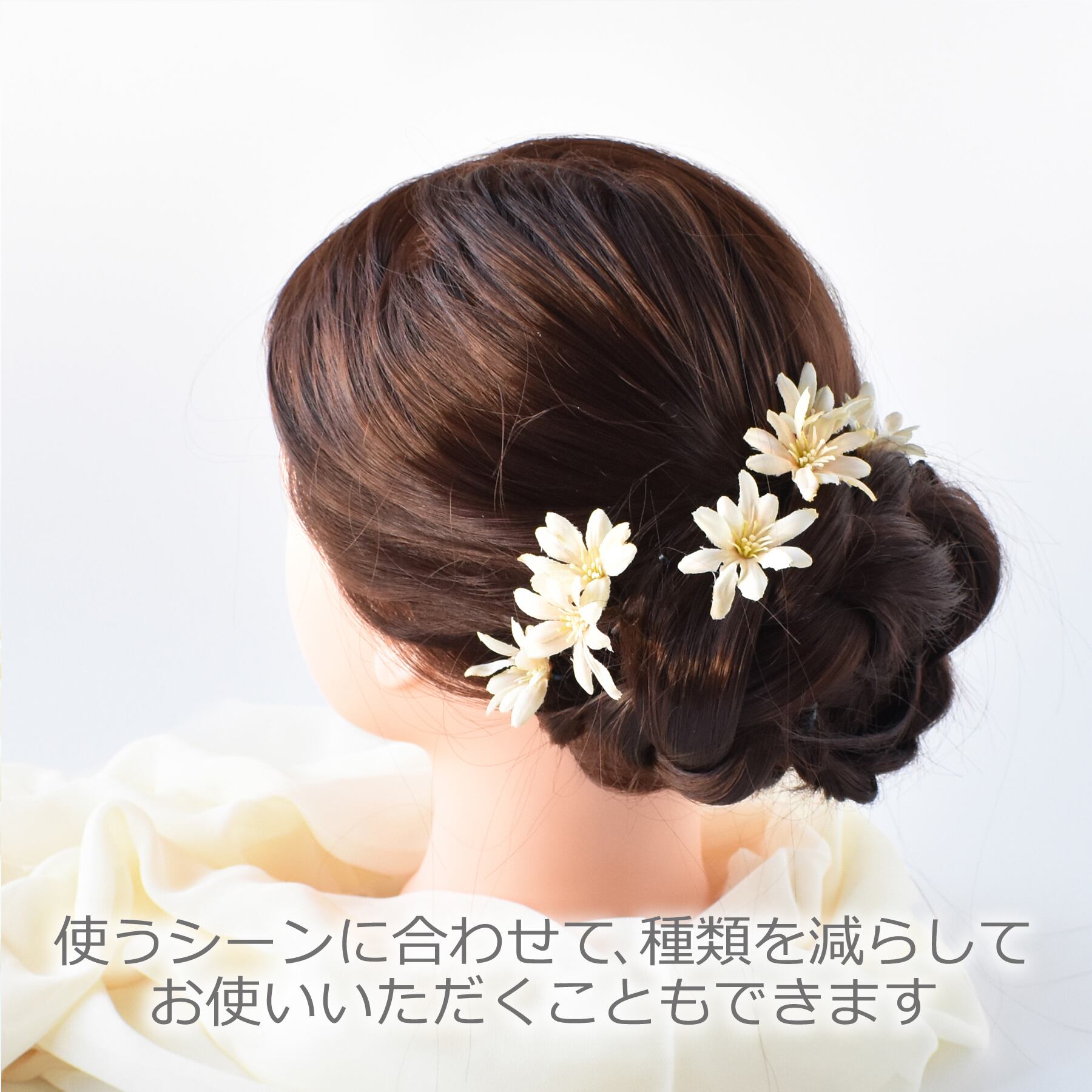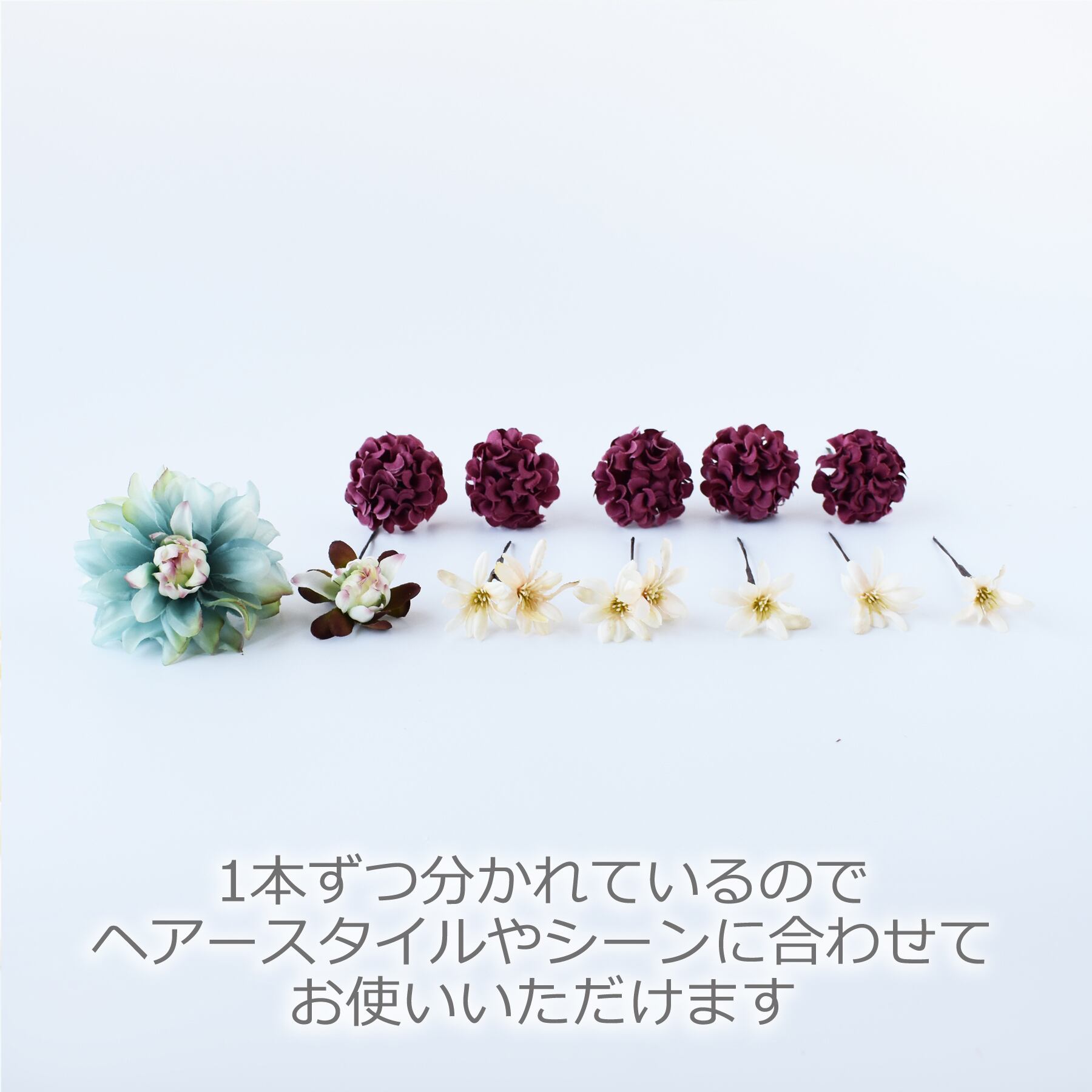 色々なヘアースタイルやシーンに合わせてお使い頂けるように、1本ずつに分けてお作りしていますので、左右にまとめてつけたり、1~2種類だけお使いいただくこともできます。