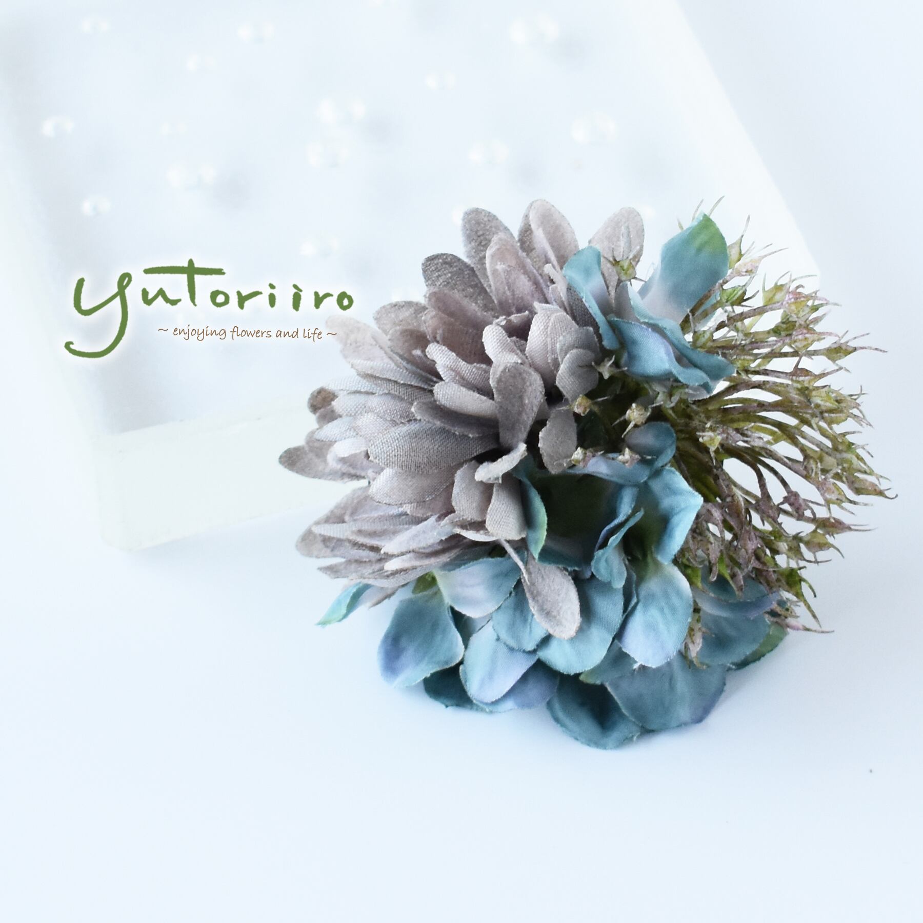 くすみブルーの紫陽花は、落ち着いた中にも明るさがあり、とても上品です。